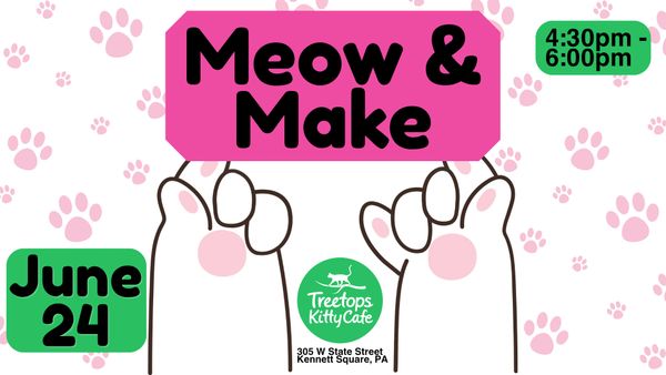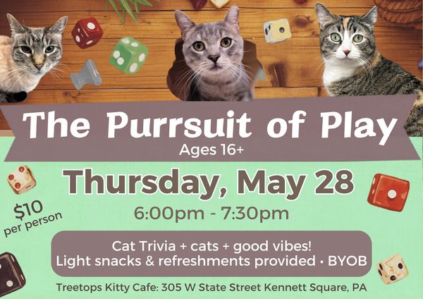 Come to The Purrsuit of Play: Cat Trivia Night at Treetops Kitty Café! Test your knowledge while hanging out with playful, adoptable kitties.