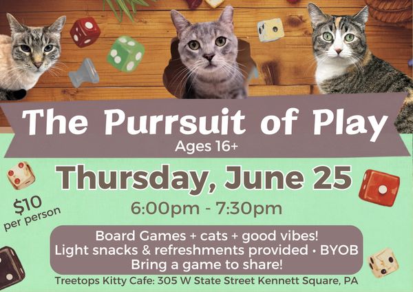 Game on! Join us for The Purrsuit of Play: Board Game Night! Play your favorite games while relaxing with friendly, adoptable kitties. 🐾🎲